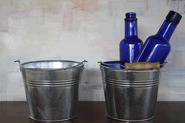 1.5 quart metal flower buckets just like these display hearty flower arrangements and healthy plants. No place for all the fresh cut flowers? Not Anymore! The optional plastic watertight liner won't leak; plants will live! Make these round metal rustic buckets into planters by drilling three small holes into the bottom (or by carefully - and at your own risk - punching three holes into the pail bottom with a hammer and nail). Hint: coat the holes with clear nail polish to prevent rusting around the holes before planning. Two regular drinks or one wine bottle will fit like intended gifts into these buckets.